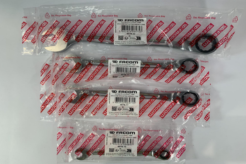 Four Facom STD Comb Ratcheting Wrenches, 10mm-17mm-17mm-22mm. .