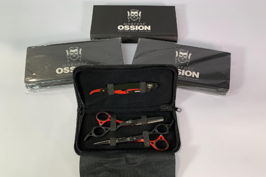 Three Sets Of Morfose Ossion Professional Systems Barber Sets, In Branded Case, Includes Scissors, Thinning Scissors And Cut Throat Blade Holder.