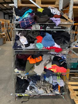 Four baskets of assorted clothing and related items.
