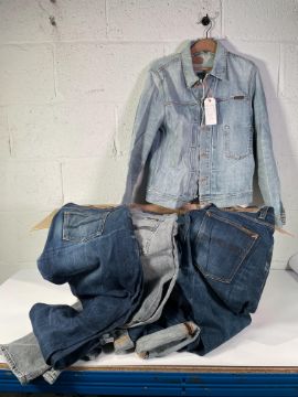 Sixteen Pairs of Nudie Denim Jeans and One Denim Jacket in various sizes and styles - All Pre-Owned (all to be repaired).