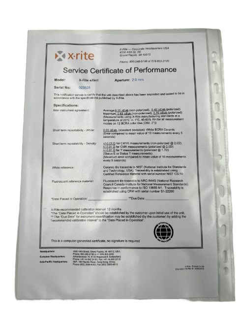Pre-owned X-Rite Exact Portable Spectrophotometer with power supply, case & certificate of performance (M/N: NGH-XRX2B).