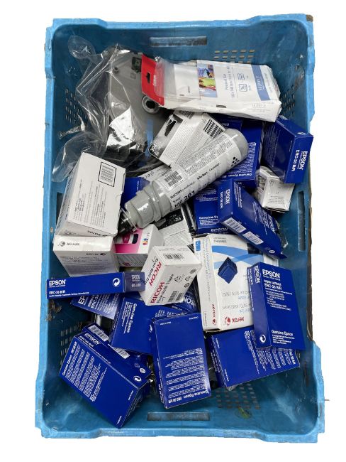 Assorted printer cartridges and related items (All items sold as seen. Crate not included).