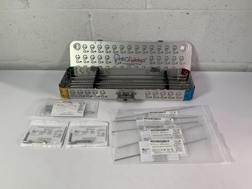 A mixed lot of Ortho Paediatrics Products (nine items) to include: 1x set of Flexible Reamers with Multiple Size Heads in a Metal Case, 2x 90 DEG Locking Cannulated Child Blade 40mm x 6mm x 3 Hole (REF: 00-1200-3503), 1x Extraction Adaptor (REF: 01-1500-9018) and 5x Guide Pins, 2.8mm x 300mm, COCR (REF: 01-1071-012).