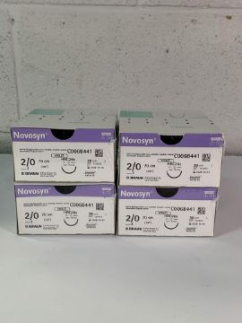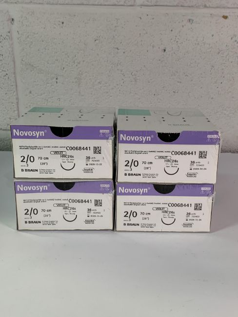 Four packs of Novosyn 2/0 70cm (28") Metric 3 Violet, REF: C0068441, EXP: 2028-10-25 (36 units per pack). As New.