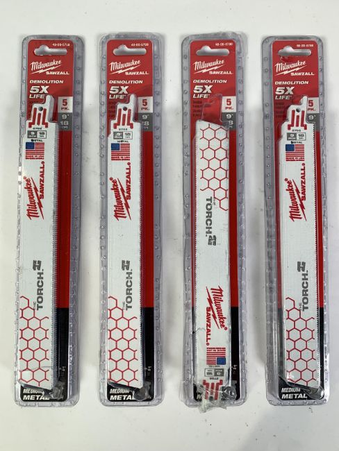 Four Packs Of Milwaukee Sawzall "The Torch" Medium Metal 18TPI 9" Reciprocating Saw Blades (5 Per Pack) Items Are But Some Outer Packaging Slightly Damaged.