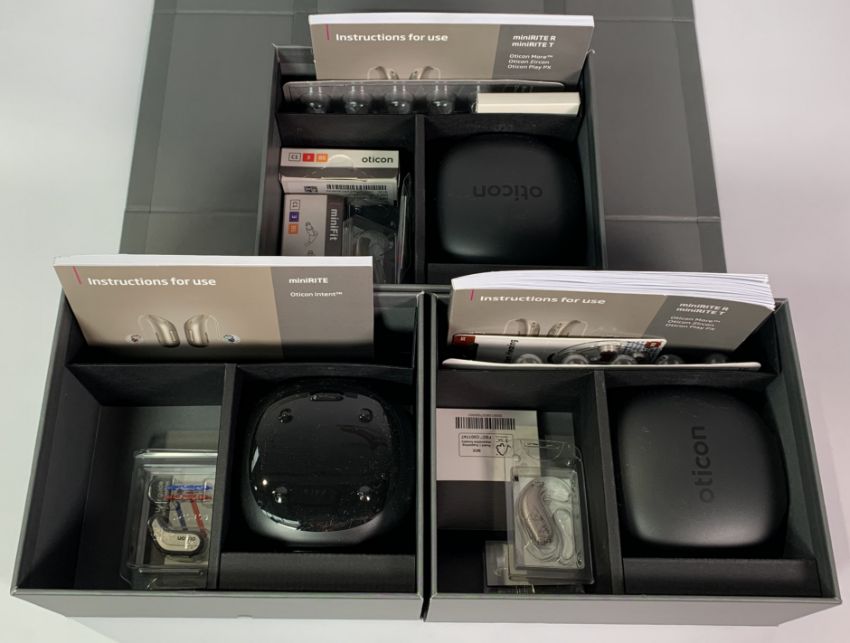 Three boxes of Oticon Hearing Aids; 2x More 3 Minirite T (REF: (240) 230284), 1x Intent 3 Minirite (REF:(240) 269601). As New (all singles).