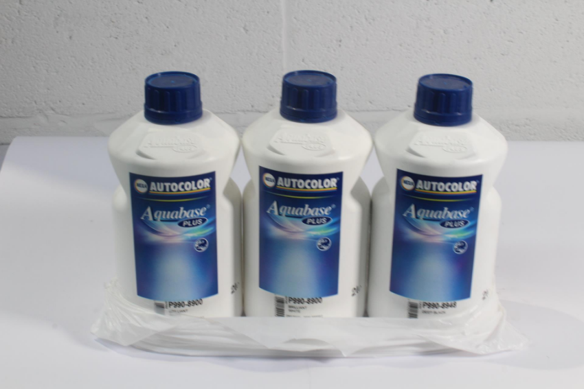 Two Nexa Autocolor Aquabase Plus P990-8900 Brilliant White and One Nexa Autocolor Aquabase Plus P990-8948 Deep Black, 2L Bottles.