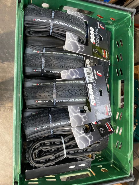 Sixteen as new Road and Cyclocross tyres to include a pair of Schwalbe Pro One TLE Addix Evolution 700c x 25 plus Tubeless Sealant, a pair of Vittoria Terreno Dry Cyclocross 700c x 31 Tubeless Ready, a pair of Vittoria Terreno Mix Cyclocross 700c x 31 Tubeless Ready, a pair of Vredestein Black Panther Cyclocross 700c x 33, one Vittoria Cross XL Handmade Cyclocross Tubular (Tub) 700c x 33, one Michelin Pro 4 Endurance 700c x 23, a pair of Giant PSLR1 Road 700c x 23, a pair of Giant PSLR1 Road 700c x 25 (lightly used) and a pair of Pirelli Cinturato Velo Road 700c x 26 (lightly used).
