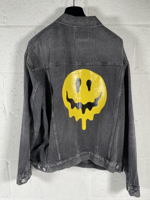 As New Balenciaga Smiley Face Print Denim Jacket - Faded Black - Size XS International - Certificate of Authenticity on Request.