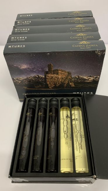 Six boxes of Catena Zapata Adrianna Vineyard, assorted 100ml Sample Tubes, five per box to include Fortuna Terrae Malbec 2020 Red Wine, White Bones Chardonnay 2021.