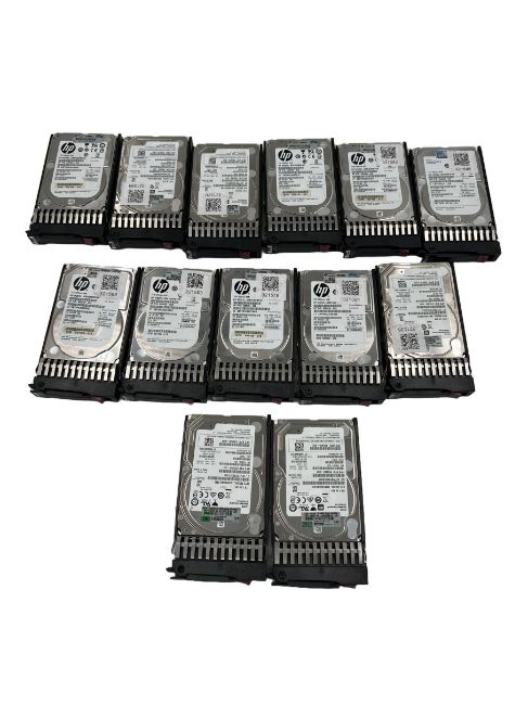 Thirteen pre-owned HP 605832-002 1TB 7.2K SAS Hard Drives with server trays (Data wiped).