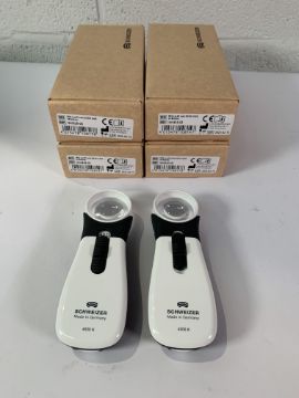 Two Schweizer Ergo-Lux Mobil Magnifiers with Light, 48D 35 4500k, REF 164482B-GB and two Schweizer Ergo-Lux Mobil Magnifiers with Light, 56D 35 4500k, REF 164562B-GB. As New.