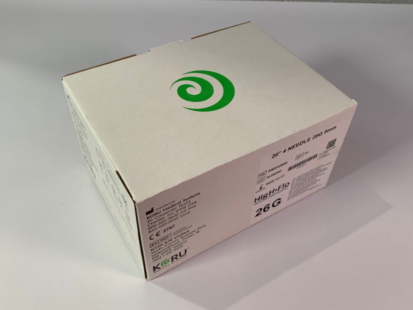A box of sixty Koru Medical Systems, High Flow 20" 4 Needle 26G 9mm (REF: RMS42609). As New (EXP: 25/12/17).