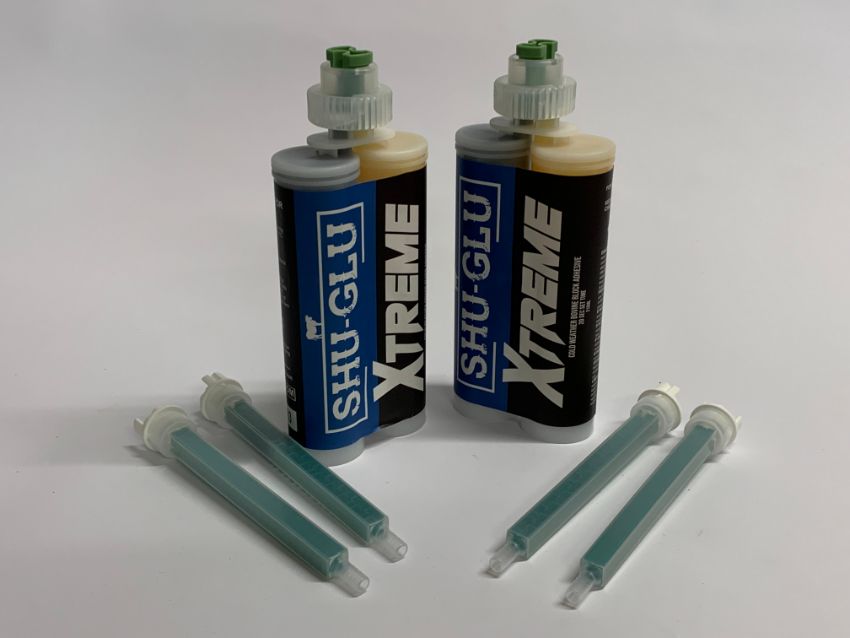 A box of twelve Shu-Glu Xtreme Cold weather bovine block adhesive with a bag of mixer tips. As new