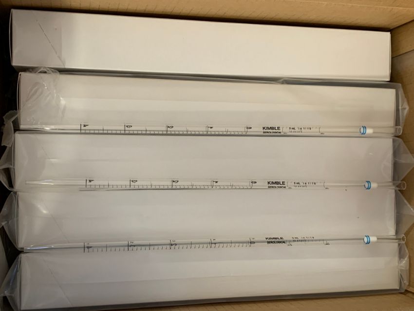 Box of 500, Kimble Chase polystyrene Pipets (56700-5110) size/cap 5x1/10mL. As new