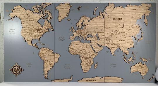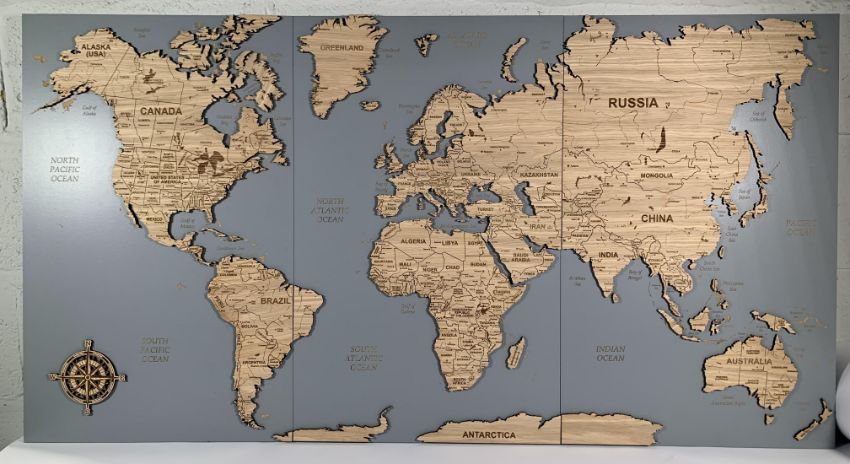 Hand Crafted Oak Wood 3D Detailed World Map, Home Decor - 3 Piece Set, Grey Background, Size 70 x 44cm (28 x 17 inches)