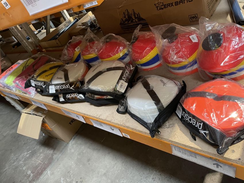 Six Essential Saucer Cones (set of 50 x 6), 40 Adult Mesh Training Bibs (orange, purple, Red and yellow - 10 each) and Pro Near Flat Markers (8 sets of 40, assorted colours) - All new from Precision.