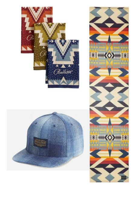 Three as new Pendleton items to include "Fire Legend" Rubber Yoga Mat, pack of 3 Bandanas and a Flat Brim Navy Ombre Mix Snapback Hat (stock image).
