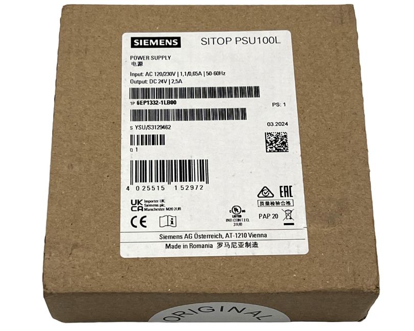 As new Siemens SITOP PSU100L 24 V/2.5 A Stabilized Power Supply (P/N: 6EP1332-1LB00) (EAN: 4025515152972) (Box sealed).