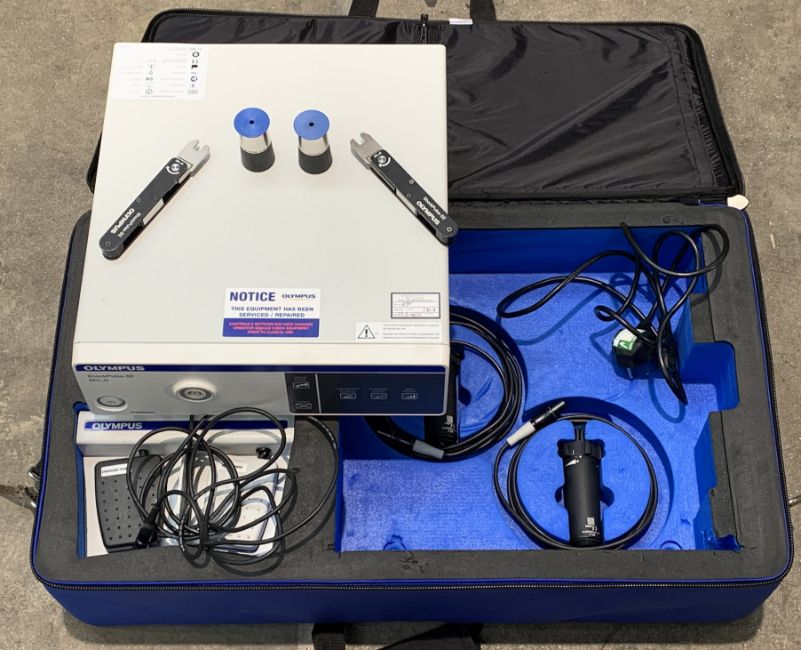 Pre-owned Olympus EGSPL-SR (SPL-G) ShockPulse SE Lithotripsy System with power cable, two SPL-T Handheld Transducers, two SPL-NC Nose Cones, two SPLT-W Torque Wrenches and a SPL-FS Foot Switch. Item powers on but has not been tested further.