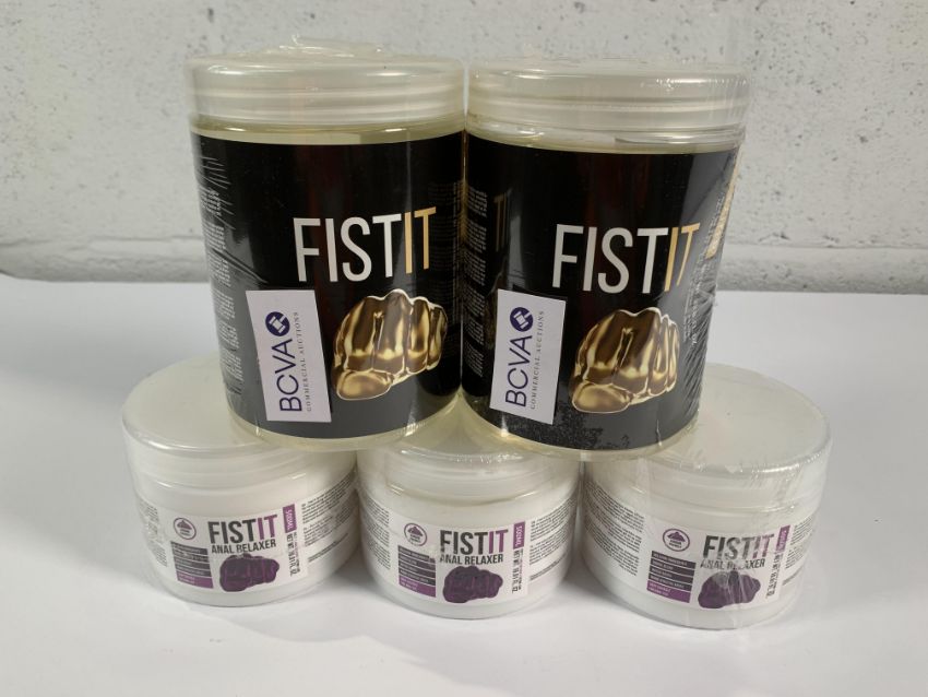 Five Fistit Branded Related Items -Three Anal Relaxers (3 x 500ml) and Two Water Based Relaxers (2 x 1litre) Item Has Slight Indentation on Packaging