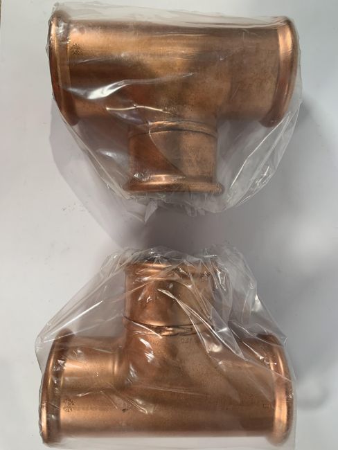 Two as new Copper Plumbing Industrial Tee Branches, approximately 27.3cm Length - 22cm Height - 10.2cm Diameter (Hole).