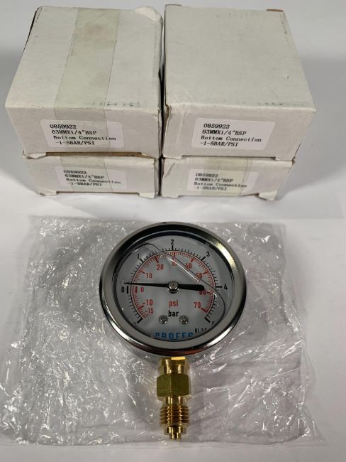 Four Profec Manometer, 1-5 Bar/Psi, 63mm Male, Bottom Connection 1/4" BSP (0859922).