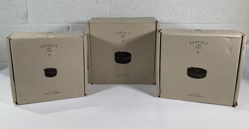 Three Surface For Serax Collection by Sergio Herman Enamelled Cast Iron Various Sized Pots, 2 x Black, 1 x Green Version. Boxes Have Slight Signs of Wear. (B8718101/ B8718105/ B8718103)