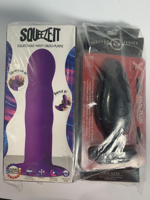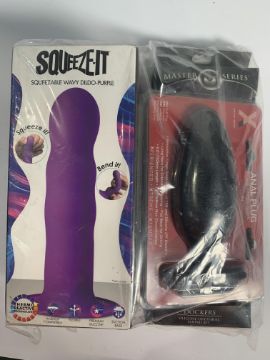 Three Adult Items Squeeze It Wavy Purple Dildo, AnalPlug With Finger Grip and a Master Series Dockers Silicon Urethral Sound Set (Over 18s Only)