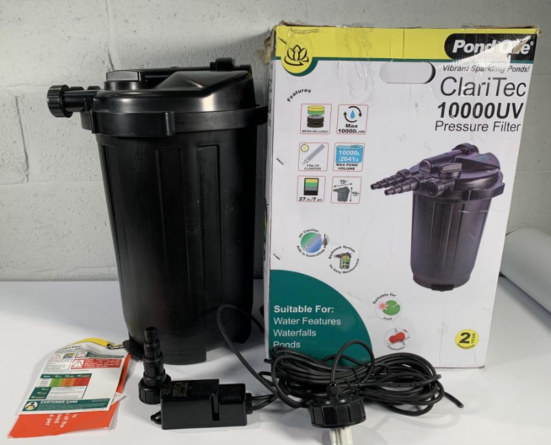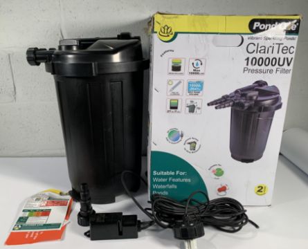 Pre-owned POND ONE ClariTec 10000UV Pressurised Pond Filter, Size 56cm Height x 39cm Depth. Outer box damaged.