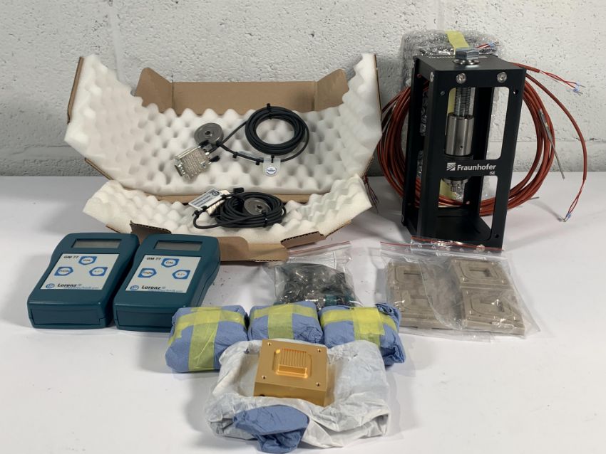 Fraunhofer ISE Assortment of Components for Laboratory PEM Water Electrolysis Test Cells. Includes 2x Lorenz K-12 Sensors, 2x Lorenz GM 77 Signal Amplifier, 2x Cage (fixture), 2x Gold Plated Titanium Body Anode and Cathode and Other Related Items.