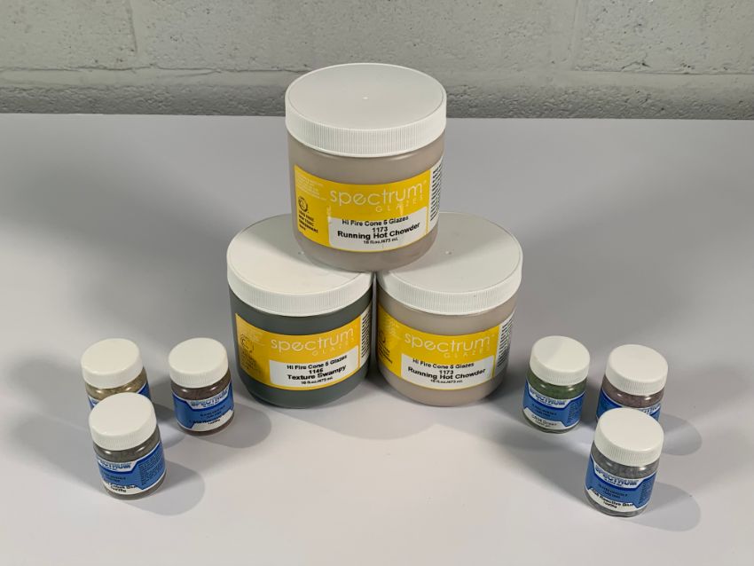 Nine Items by Spectrum Glazes for Pottery, 3x Brush on Glaze 473ml, 5x Glaze Crystals Colours include Yelllow, Green, Maroon, Reactive Green, Colbalt Blue and Reactive Blue. As new