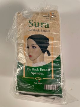 Approximately eighty packs of twelve Sura Tie Back Bonnets - Spandex - Black.