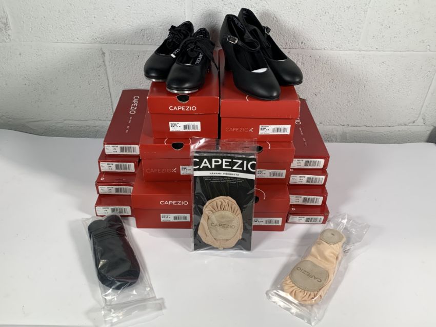 Seventeen items of as new Capezio Dance Shoes including Tap, Jazz, Student Footlight and more. Various colours and sizes.