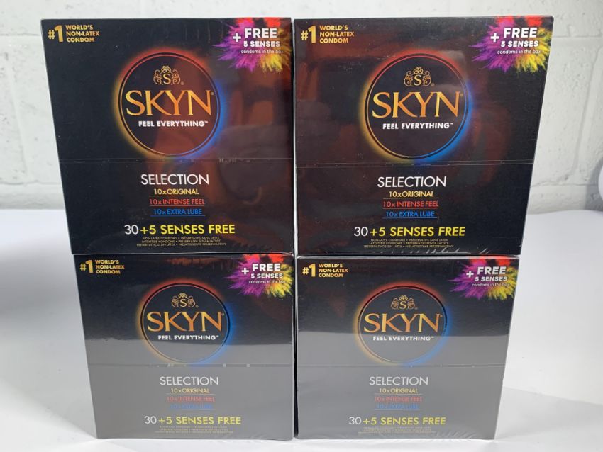 Four Boxes Of SKYN Selection Condoms Each box contains 30 + 5 to include 10 x original, 10 x Intense, 10 x Extra Lube, 5 x Senses Exp 05/2025 (Over 18s Only)