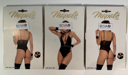 Three Mapale Lingerie Leather Effect Bodysuits With Cuffs, Includes Detachable Chain Wrist Straps and Harness, Size S/M, Black (2705) Outer Package Has Slight Damage, Item As New. (Over 18s Only)