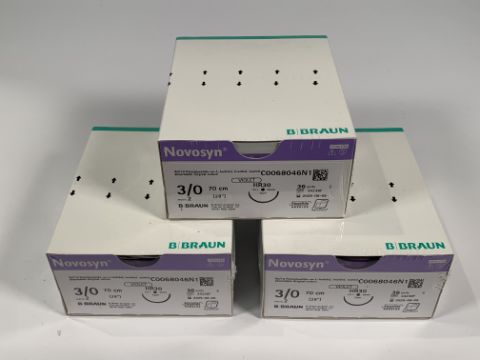Three boxes of as new B Braun Novosyn Absorbable Surgical Suture Violet (REF: C0068046N1) 3/0, 70cm, Metric 2 (EXP: 2029/06/05, 36 units per box).