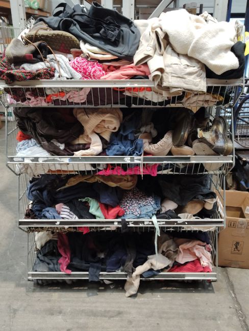Four baskets of pre-owned clothing to include t-shirts, bags, shoes and more.