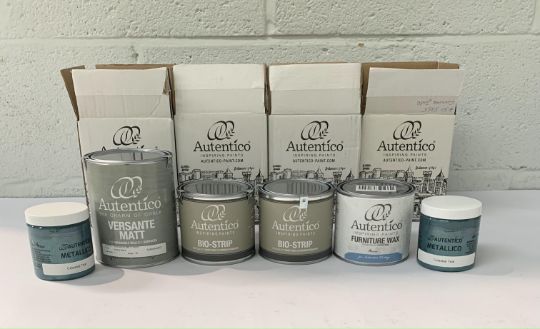 Autentico Versante matt nearly black paint 1L,, two Autentico Bio-Strip high quality paint, wax, varnish remover 2 x 500ml, Autentico funiture wax 500ml, two Authentico Metallico celestial teal 2 x 250ml.