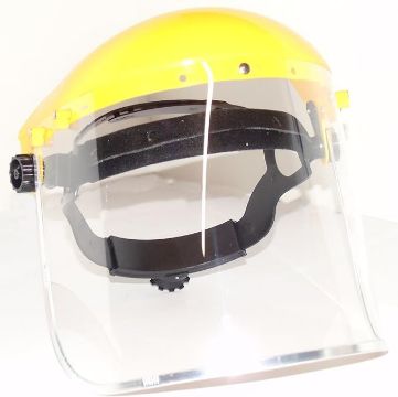 Twenty as new ESENO Industrial Clear Wide Visor Safety Face Shield and Yellow Brow Guard Flip up Visor (stock image).