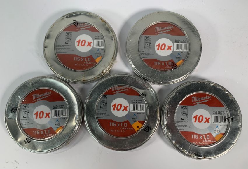 Five Milwaukee Packs - Thin Metal Cutting Discs (10 units per pack - total of 50 discs) 115 X 1,0 (some outer packaging slightly marked) (4932478997).
