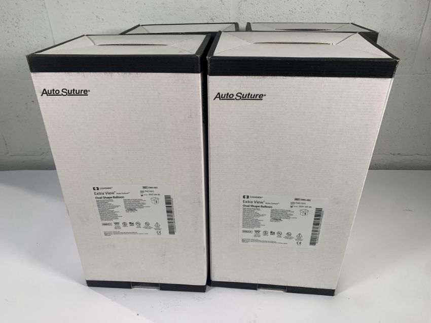 Four boxes of Covidien Extra View Auto Suture Single Use Oval Shape Balloon (five items per box) (REF: OMS-XB2, Use-by: 2027-04-30).