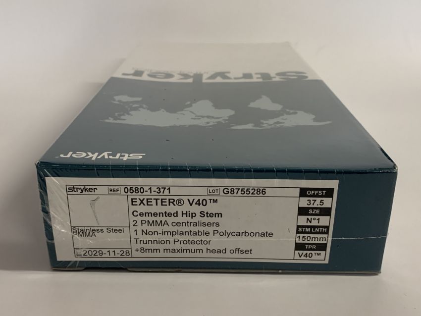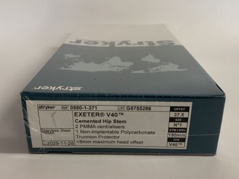 As new Stryker Exeter V40 Cemented Hip Stem, Stainless Steel 2 PMMA, Offset 37.5, Size N°1, STM Length 150mm, (REF: 0580-1-371, EXP: 2029-11-28).
