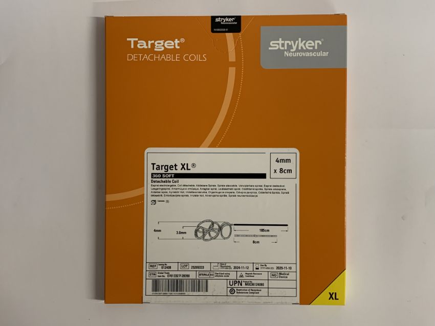 As an new Stryker Neurovascular Target XL 360 Soft Detachable Coil (REF: 612408) 4mm x 8cm (EXP: 2029/11/10).