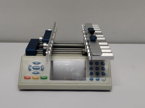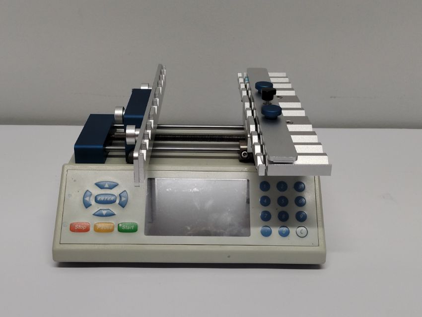 A pre-owned Chemyx Fusion 200 digital two-channel syringe pump, holds syringes from 0.5µL to 60mL. Includes 10 syringe rack. (sold as seen).
