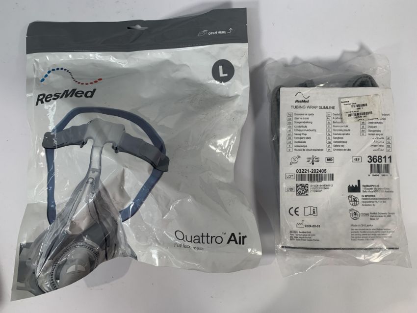 An as new ResMed Quattro Air Full Face Mask, Size: L (REF: 62707) and an as new ResMed Tubing Wrap Slimline (REF: 36811).