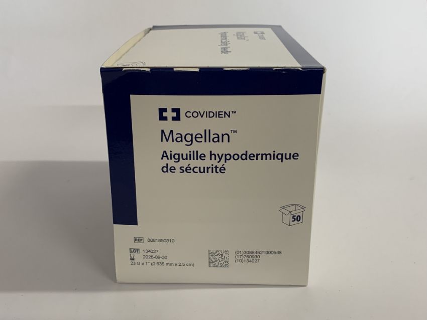 Two boxes of Covidien Magellan hypodermic safety needles (10 packs of 50 needles per box, REF: 8881850310, EXP 2026-09-30).