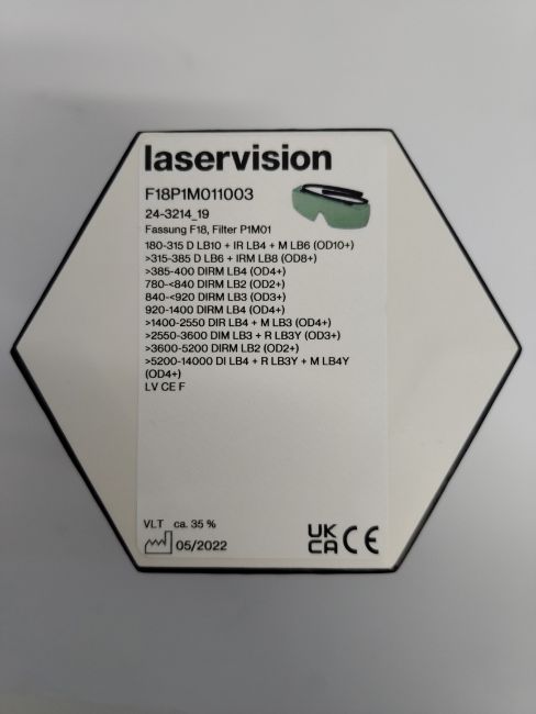 An as new pair of LaserVision laser safety goggles, wavelength range: 180 to 11500nm acc. EN207. Fassung F18, Filter P1M01, filer colour: light blue (REF: F18P1M011003).