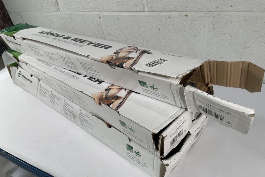 Five as new Konig & Meyer 21080-300-87 "Soft Touch" microphone stands - grey (some damage to packaging).