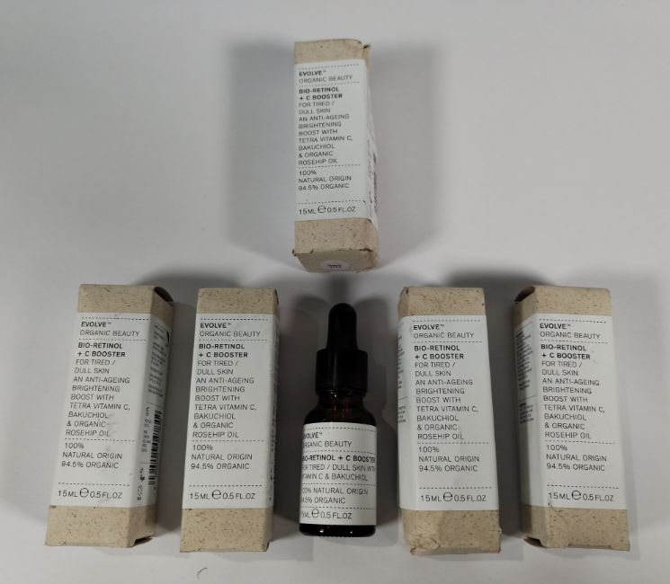 Five Evolve organic beauty - bio-retinol + C booster, certified organic vegan cruelty-free, 15ml bottles.